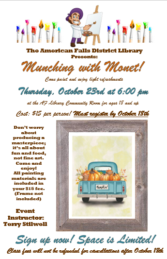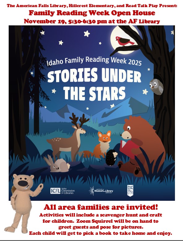 Kindra Munk – our current American Falls District Library Director is retiring in the end of March 2026. We will be accepting applicants for her position as a full-time Library Director of this remarkable and successful rural library beginning October 1, 2025. Our library serves almost 5,000 patrons. Click on link below for more information and a full job description