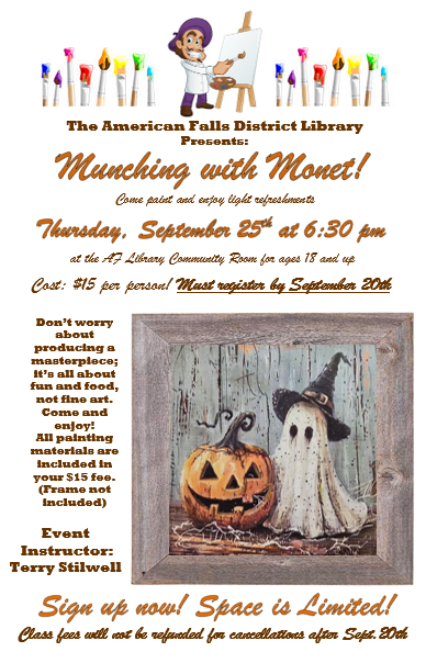 Adult art classes with instructor Terry Stilwell are offered monthly, generally on the 4th Thursday of the month. Pre-registration is required, and space is limited. Cost to register is $15 per person and covers all the painting materials needed (excluding the frame). For ages 19 and up. Refreshments will be served.