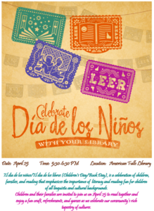 El día de los niños/El día de los libros (Children's Day/Book Day), is a celebration of children, families, and reading that emphasizes the importance of literacy and reading fun for children of all linguistic and cultural backgrounds. Children and their families are invited to join us on April 25 to read together and enjoy a fun craft, refreshments, and games as we celebrate our community’s rich tapestry of cultures.